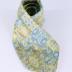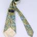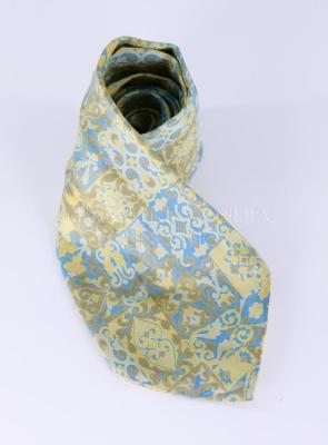 Long men's necktie, in printed silk with a renaissance style pattern of yellow, blue, grey and pale grey scrolled frames with acanthus, floral and heart shaped forms. Lined with white silk with embroidery "Nina Ricci".
