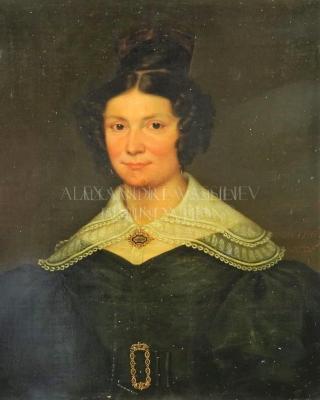 Painting portrait of a young woman with giraffe hairstyle and Spanish peineta, wearing a necklace with pendant and a typical 1830s belt buckle. The portrait is probably a self-portrait of the painter, the countess Olympe de LERNAY .