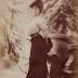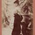 Paper photograph on cardboard base depicting a young woman, a famous French actress, dancer and singer, Arlette DORGÈRE (born Anna Mathilde Irma JOUVE, 8 June 1880 – 1965). She is represented in a fine guipure lace bodice, with a high collar with three tear shaped lewels under the chin, three quarter sleeves, embellished with some jewels on the elbows, and a simple skirt, probably in velvet, with a tight belt with vegetal pattern. She is holding a long fur mantle lined with silk. The lady is standing near a stone bench with a background of snowed pine trees.