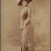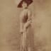 Paper photograph on cardboard base depicting a young woman, a famous French actress, dancer and singer, Arlette DORGÈRE (born Anna Mathilde Irma JOUVE, 8 June 1880 – 1965). She is represented in an outside gown consisting of a long silk jacket and a matching straight skirt. The jacket is embellished with vertical rows of small round decorative buttons, trimming the front borders, with two lines going down the chest and the beginning of the three quarter sleeves. The lady is wearing a short pearl necklace, a bracelet high on each hand, a hat with ostrich feathers and holding a pair of gloves.