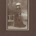 Paper photograph on cardboard base, representing a portrait of a middle aged wealthy woman standing in a photographer's studio leaning on a bench on the forest background. The lady is wearing a winter gown consisting of a long fur stole covering her neck and the shoulders, a matching fur muff, and a long dress, with a finely pleated bottom of the skirt, separated from the main part with floral embroidered border, and richly embroidered with beads bodice. Her updo bun hairstyle is hidden under a large hat with ostrich feathers.
