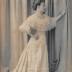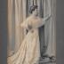 Paper photograph on cardboard base representing a young woman standing in profile, and holding to a curtain in a photographer's studio background, modeling a long dress, with the bodice hidden under three levels of lace flounces; larger lace inserts decorate the bottom of the skirt with a small train. The lady is wearing a bracelet on her left wrist, and her hair is styled in a fashionable updo bun.