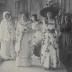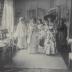 Paper photograph representing five young ladies in a wealthy interior house, wearing masquerade costumes for an amateur piece prepared by Jeanne AUBRY (1887 - 1975) (figure on the right of the photograph), daughter of Fourrier Eugène "Marcel" AUBRY (1854 - 1932), merchant-manufacturer of lace in Mirecourt. On the front in the Spring costume: Elisabeth BUFFET (1888 - 1966), daughter of Pierre Paul Louis BUFFET (1855 - 1907), farmer, owner, editor-in-chief of the "Nouvelliste des Vosges" in Mirecourt. On the front in the Summer costume: Geneviève AUBRY (1885 - 1975), Jeannette's sister. On the back in the Autumn costume: Madeleine BUFFET (1890 - 1975), Elisabeth's sister. On the left in the Winter costume: Marthe AUBRY (1885 - 1969), sister of Geneviève and Jeanne.