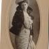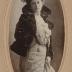 Oval cut paper photograph on a cardboard base, representing a portrait of a woman standing in a short fur jacket with long sleeves, large shoulders and high standing round collar, wearing a silk dress with lace neckline on the bodice and a high collar, embellished with a brooch in the center and a short pearl necklace. A round pocket watch on a short chain is hanging on the waistline. The look is completed with a medium large hat adorned with small flowers on the top and the front.