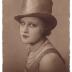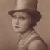 Press postcard representing a photograph of the cabaret star Halina DORSOWNA in her stage costume consisting of a low-cut dress with two ribbons at chest level, a pearl necklace wrapped 3 times around the neck and a top hat. The cabaret girl is made up as a typical Roaring Twenties style a small heart-shaped mouth, fine and long eyelashes and strongly marked eyebrows above and below with a short haircut.