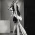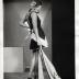 On the back of the photo, a label in English and France give the following description : The bathing costume bows to the dictates of 1930. A feminine swimming suit with pink jersey inserts to insure width and the high-waistline marked with buttons. The pink wool coat and cap trimmed with rubber roses are extremely flatterring Mary NOWITZKY.