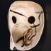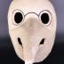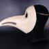 Plague doctor mask made of papier-mâché and painted in white, with holes for the eyes, with black contours, and at two sides of the beak.