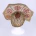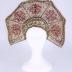 Costume headdress possibly for ballet and opera, in the style of Russian traditional kokoshnik. The handmade headdress is decorated with multiple rows of white pearls, and multicolored rhinestones sawn to the fabric, as well as embroidery in blue and red thread. The polygonal headgown is streched out by a number of wires and the cap part covering the back and front of the head has an elastic strap. Multichrome sequins decorate the back cap of the kokoshnik.