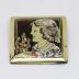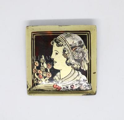 Square brooch in bakelite, imitation tortoiseshell, decorated with a stylized portrait of a woman.