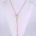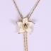 Gold plated slider necklace, ajustable by size and length, made of a long thin chain sliding on the back of a small orchid pendant, covered in white enamel and decorated with tiny silver rhinestones in the center.