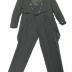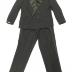Black wool men's tuxedo suit consisting of a coat, a tailcoat jacket, both double breasted with black silk peak lapels and four pockets on the coat and two upper pockets on the jacket, and a pair of pleated trousers with one strip. The coat and the jacket are lined inside with black silk, and white silk with thin black stripes inside the sleeves.