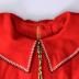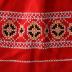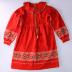 Bright red dress in thick wool with long sleeves and high waistline by the bust. It features rounded collar and Eastern European ethnic inspired embroidery in white, yellow and black thread by the hems and sleeves, and a decorative string from the same colours at the neck. Given the tight shoulders and the size of the dress, probably made for an adolescent.