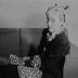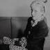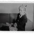 Amateur photograph representing a woman sitting on her sofa in her apartment on rue de Bourgogne in Paris. She wears a dark colored waist and on her head a hat matched with panther fur mittens created by the Schiaparelli house in 1938.