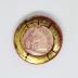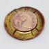 Dress clip in enameled ceramic representing a medallion with a profile of a horse head inlaid in a red circle covered with golden leaf.