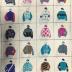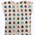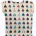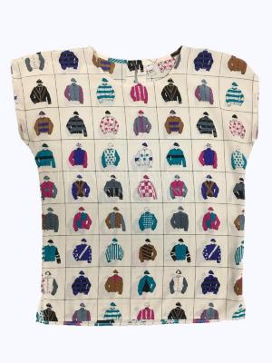 Women's short sleeved blouse, in white polyester, with printed pattern of multicolour jockey jackets and hats in black net. Fastens on the back of the collar with one button.
