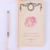 Dance card with a program of 24 dances in the form of a booklet. A pink string is holding it together and attached to it is a pink pencil. The cover has a pink drawing of a woman with a hat and a man, some black garland, and the back has an image of a woman being carried in a palanquin by two men. There are flowers framing the pages where the program is laid out.