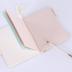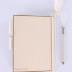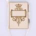 Dance card notebook hold together by a white string to which is attached a white pencil. The booklet is composed of eight blank pages, the first and last ones are blue and the middle ones are pink. The cover is frame by a gold line with a duke crown on the top of the frame, and on the side, there are two silk ribbons meant to secure de pencil.