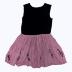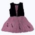 Children's dress, probably for a teenage girl, made of pink silk crepe and black velvet. The top half is sleeveless and velvet. A V-shape is made with the same silk material used in the bottom half. At the very center is stitched a treble clef, and more are found on the bottom of the dress.