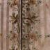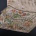 Men's oyster silk stripe waistcoat with stand collar, shaped pocket flaps concealing linen lined curving pockets with three faux buttons, decorated with fine floral embroidery in pastel hues, embroidered self buttons including two faux at top, linen lining and back with laces.