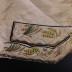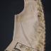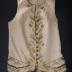 Beige waistcoat with round neckline has embroidery of flowers down the middle. The flowers and the leaves are curving outwards from both side of the oppening. The embroidery continues at the botton but only in the front of the vest. The neckline, the opening, the botton of the vest as well as the pockets are outline with a dark blue. There are strings in the back to adjust the waistcoat. The 16 buttons are in golden brass with black center.