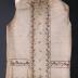 Beige men's vest with round neckline. In the middle it has a large rectangle going from the neckline to the botton with two vertical rows of buttons. There are three vertical lines of floral embroidery on it, the ones on the extremities are more charge and the one in the middle is only a few spaced out flowers. The same dense embroidery is present at the bottom of the waistcoat and on the two pockets that are shape like rectangles.