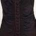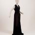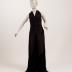 Black silk crepe evening gown with V-neck at the front and back, front closure with covered buttons to the hip, with puffs gathered shoulder straps and the front of the bodice, black satin flounce inserted at the front of the skirt; with a wide silk satin bow-tied belt on the back and black satin border at the hem.