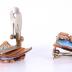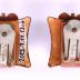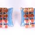 Pair of blue square shaped copper clip-on earrings. Down the front is a modern illustration of vines and leaves. A thin line runs down the center and on each side are two small flat circulat discs, representing a plant. All on the blue enamel background.