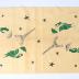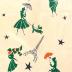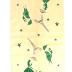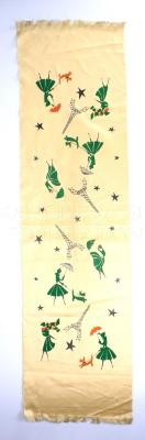 Yellow satin scarf with fringes, decorated with green and orange felt women profiles, having a walk with their Scottie dogs. They are surrounded by black stars and Eiffel towers.