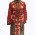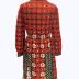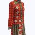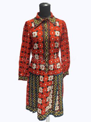Knee-length dress with collar. The opening can be close with buttons and stops near the waist. The top half has red flowers with white center all over and has white flower next to the opening. The band under the buttons and the collar are black with geometric lines and shapes in the colors blue, yellow, red and white, which is also found on the cuffs, the bottom of the dress on the peades found on each side and along the end of the dress.