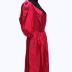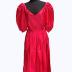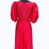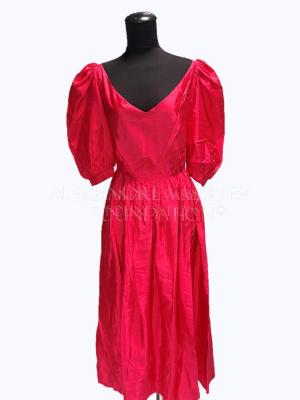 Hot fuchsia pink dress with puffy sleeves. It cinch at the waist and then flares out. Has a large V neckline. Lined with beige fabric. Zipper down the middle of the back reaching just under the waist.
