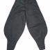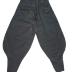 Men black puffy trousers made of synthetic fabric, lined with grey and white striped cotton, and white polyester for the three pockets. It has loops to put a belt, a small pocket on the right leg and a silver zipper on each ankle.