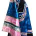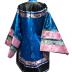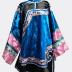 Women tunic made of a piece of blue silk, adorned with butterflies and chrysanthemums, and lined with a pink braid embroidered with fish. At the top and the bottom of this blue piece, two black silk pieces framed with white embroidered braid are sewn. The sleeves are made of blue and pink silk, lined with green embroidered braids. Two glass beads are forming the overlapping closing system.