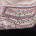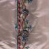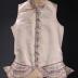 Beige silk winter men's vest with floral embroidery on the collar, the opening all the way down to the sides at the bottom and the pockets. At the same places, the borders have a blue line followed by a curvy zig-zag line in pink. Green leaves and blue flowers on a curvy steam follow those lines. Under it is a curvy pink line.