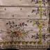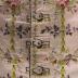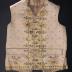 Beige silk men's vest embroidered black line at the border on the collar, the opening all the way down to the sides at the bottom, the pockets as well as rectangles around the hole for the buttons and under the buttons. There are pink roses and green and purple leaves concentrated around the opening and at the bottom of the wasitcoat. On the space without leaves and flowers are blue dots with green line coming out from under spread out.