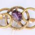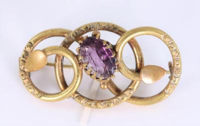Gilt metal and amethyst stoneĀ in twist frame brooch. The vine like frame has been engraved further with floral details.