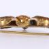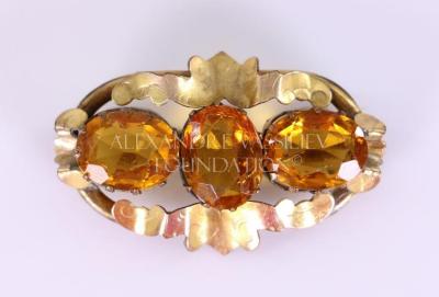 Gold brooch with flat openwork frame. In the center of the brooch are three orange citrine gemstones. The one in the middle is positionned vertical and the onse on each side are positionned horizontally.
