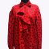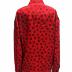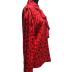 Red woman blouse with ornament of small black frames, long sleeves polyester blouse with classic collar, embellished with imitation of jabot.