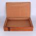 Large rectangular box entirely covered by a brown leather with a lid remarkably decorated with an iris decoration in the Art-Nouveau style, worked with the pyrography technique on leather and colored, the whole surrounding a golden ovale. The inside of the box is covered in plain pink silk. The box may have been used to store fashion accessories, such as gloves or haberdashery items.