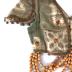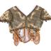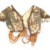 Oriental style cabaret or masquerade bodice, composed of two identical half-parts garnished with pieces of decorative fabric of various shapes decorated with gold sequins around the edge and embellished with an orange rhinestone. The top is decorated with a brown braid that runs along the ends of the garment and from which small metal beads hang. The bottom is decorated with 4 rows of wooden beads on each side.