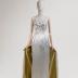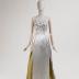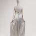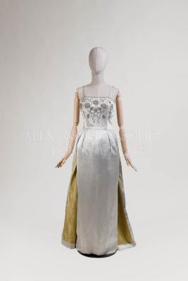 A pearl grey satin ball dress with a bodice bead embroidered with a floral pattern.