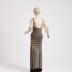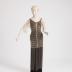 Long beaded net scenic jacket with bugle faggotings, center front fastening and 3/4 sleeves; the sleeves and the hem trimmed with long bead fringe.