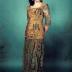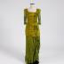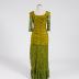 Green colour taffeta dress with olive green gipure overskirt and sleeves. Dress front embroidered with three huge beads flowers.