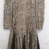 Snake skin pattern above knee length concert dress with long sleeves, ring collar, low waistline skirt and brown inserts.
