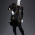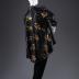 Black long jacket with golden print. Shawl collar and cuffs embroidered with golden tube beads.