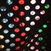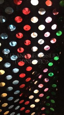 Black velvet with multicolor glossy polka dots skirt suit. Jacket has black collar and breast trimmed in black.