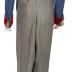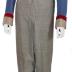 Double-breasted light blue wool caddet jacket and grey trousers.