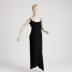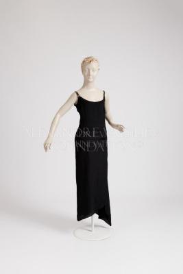 Black silk underdress with deep rear V-neck, straps decorated with white and blue rhinestones, hook-and-eye fastening in the side seam, slits at the hem.