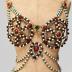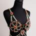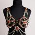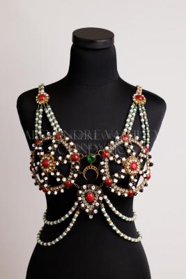 Decorative women's harness with breast pads for oriental dancer; made of black and white Murano glass beads, metal, rhinestones, white and green dyed beads, burgundy cabochons and a green glass insert with a crescent moon in the center chest.