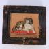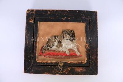 The embroidery refers to Hector, Nero, and Dash with the parrot, Lory, painting by Sir Edwin Landseer, 1838. Queen Victoria's pets. Lid inteior with printed black cyrillic text and a russian heraldic symbol of the Sleptsov (Слепцовы) Family, indicated to be for V.V. Klevezal. attributed to Pav. Vas. Sleptsov. Sleptsov (Слепцовы) are a russian noble family with mid 17th century origin. Klevezal (Клевезаль), likely the russian noble family of german uradel origin, belongs to the class of baronial and hereditary nobility of ancient pre-Petrine lineage. Both familys participated extensively in the Russian campaigns of the 19th century, namely Major General Nikolai Pavlovich Sleptsov (1815-1851) and Nikolay Efimovich Klevezal (1787-1864).