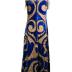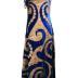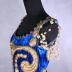 Sleaveless stage dress in blue velvet adormend by lamé arabesque swirling framed by gold embroidery galon. The neckline is embellished with a gold bobble trim, and attached at the shoulder on either side are two gold and white shoulder chains. The interior is lined in blue cotton with a white cotton bustier, with otero written in smudged ink on the interior of the left breast. Metal hook and eye back closure.